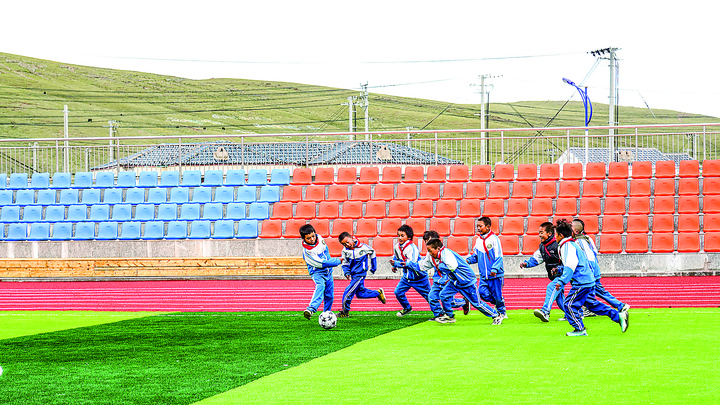 8月28日,在青海省果洛藏族自治州玛多县民族寄宿制小学的操场,学生们在上体育课。新华每日电讯记者王艳摄