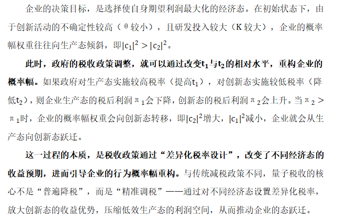 传统减税政策的问题在于,它采用“一刀切”的线性调整方式,试图通过单一税率变动,撬动所有企业的投资与创新行为。但事实上,对于处于“成熟态”的企业而言,减税带来的利润增长,并不会显著提升其“跃迁态”的概率幅——这类企业的核心诉求是维持市场份额,而非承担创新风险;对于处于“衰退态”的企业而言,减税只能缓解短期现金流压力,无法改变其“态坍缩”的趋势;只有对于那些处于“跃迁临界点”的企业,减税政策才能有效提升其“创新态”的概率幅,推动其从传统生产模式向创新驱动模式转型。